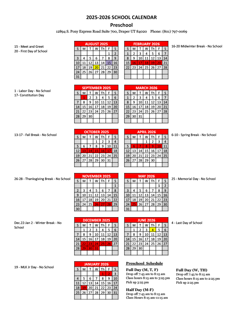 Our preschool campus is conveniently located in Draper, Utah. A campus visit allows parents to observe our preschool environment and is required for all prospective students before acceptance.
